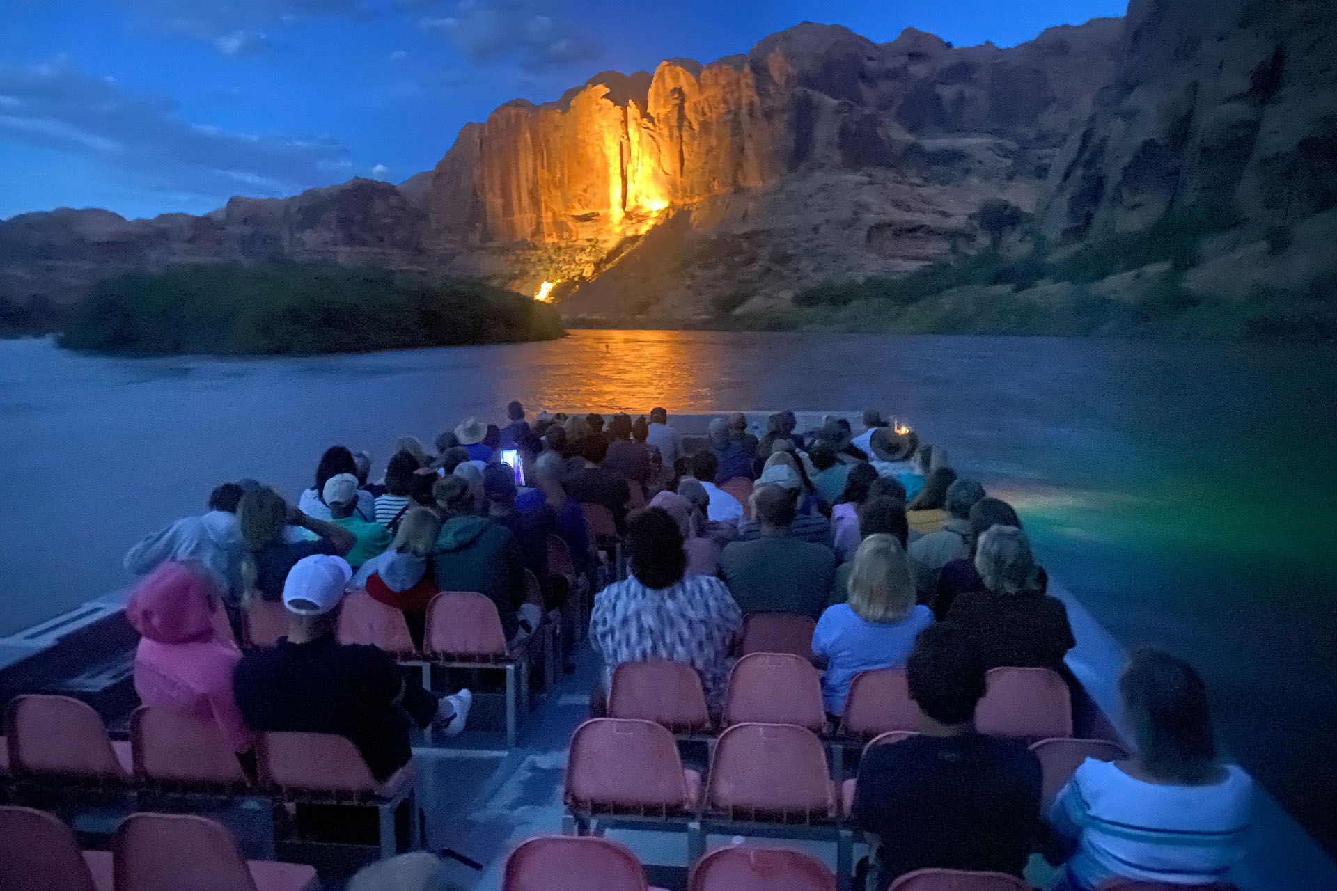 Once the boat turns upstream, the show begins. Powerful lights illuminate the towering canyon walls while stories of pioneers, Native legends, and the natural forces that shaped Canyonlands are brought to life through music and narration. The sound of the river mixes with the echoes of history, creating an atmosphere both timeless and mesmerizing.