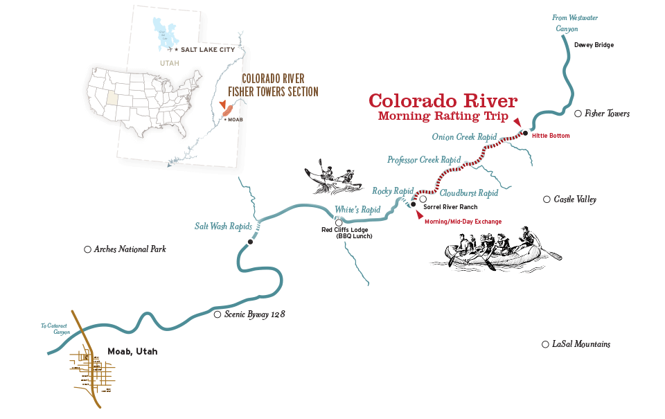 This section of the Colorado River offers mostly Class I–II rapids with calm stretches in between, plus the chance for Class III during spring high water. It’s not as intense as Westwater or Cataract Canyon, but it’s the perfect introduction to rafting—exciting enough for kids and first-timers, yet relaxed enough for families and multigenerational groups.What time does the Morning Half-Day rafting adventure start and end?